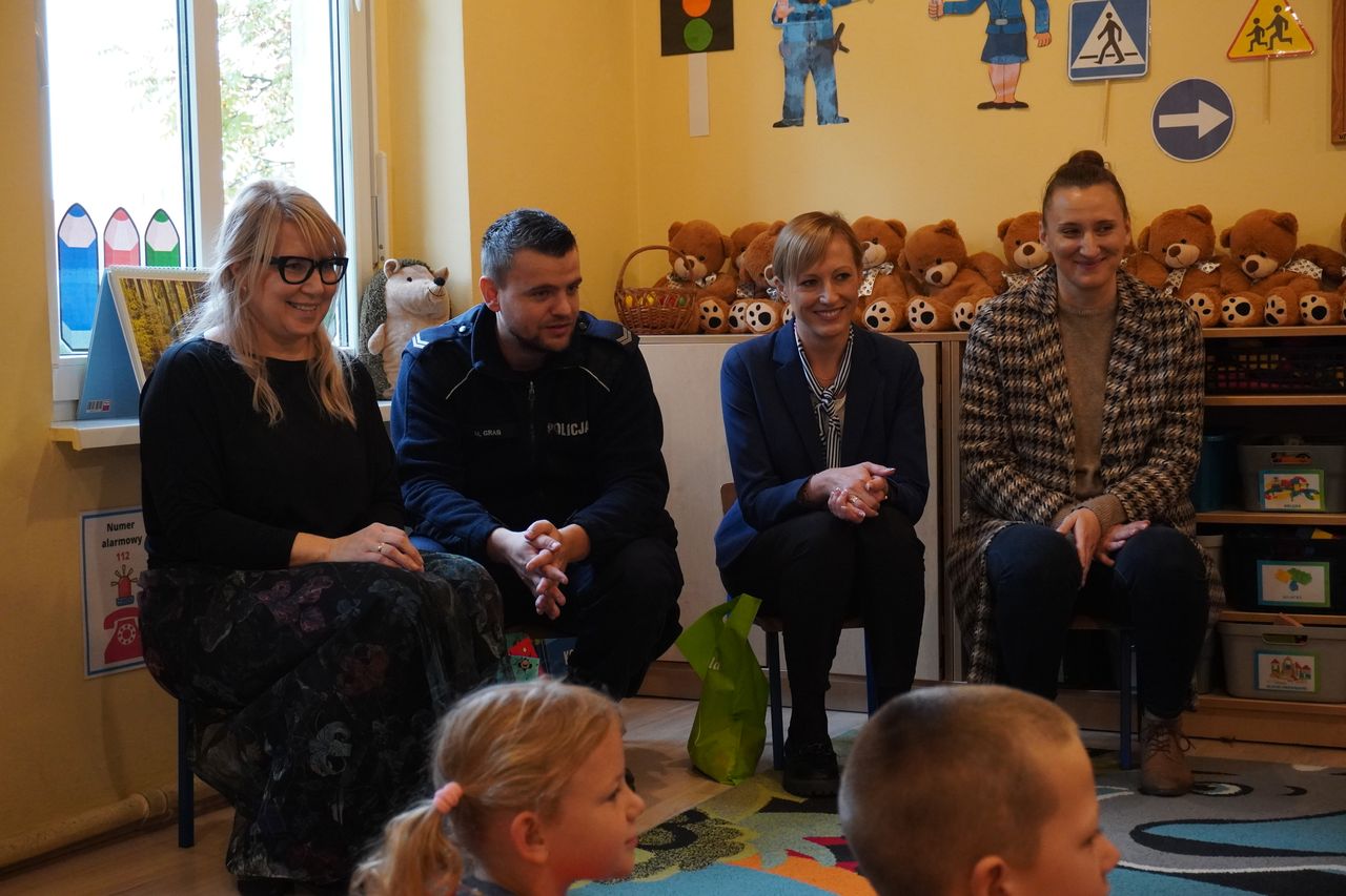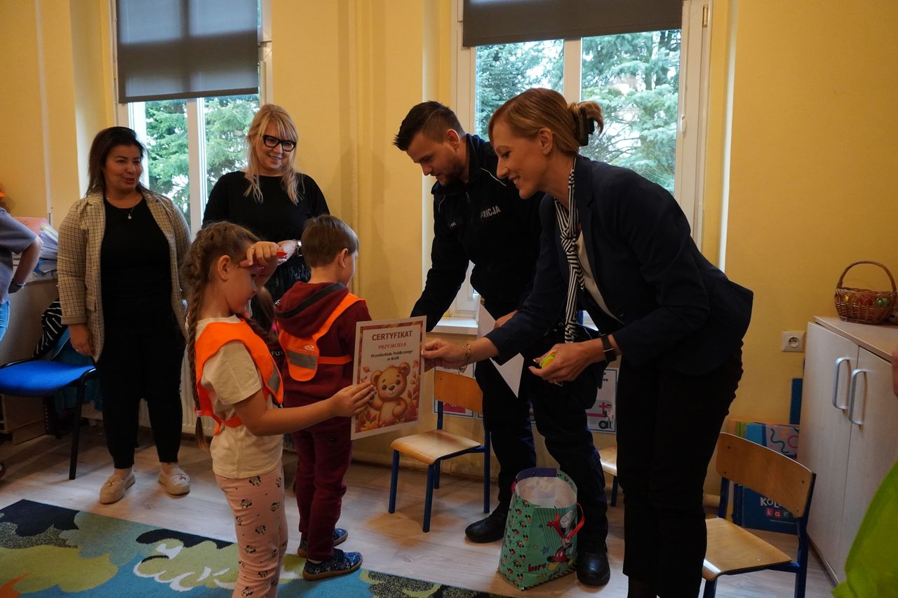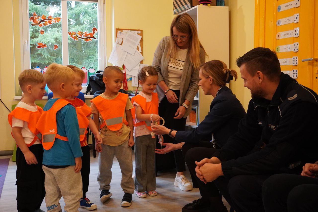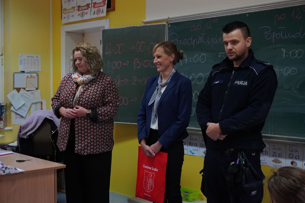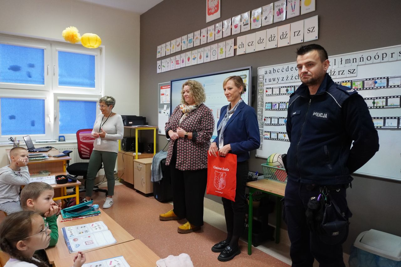 Dziś (02.10) w ramach akcji "Bezpieczna droga do szkoły", placówki oświatowe na terenie Gminy Kotla odwiedzili: Wójt Kamila Suchocka-Szperlik, pracownik urzędu Dorota Bartczak oraz starszy sierżant Maciej Grab Dzielnicowy Rejonu Gminy Kotla, którzy w trosce o bezpieczeństwo pytali najmłodszych z ich wiedzy na temat bezpieczeństwa ruchu drogowego. Dzieci z klas I-III Szkoły Podstawowej im. Kornela Makuszyńskiego w Kotli, Oddziału Przedszkolnego w Chociemyśli, Przedszkola Publicznego w Kotli oraz Niepublicznego Przedszkola „Chatka Puchatka” w Głogówku wzorowo odpowiadały na zadane zagadki i otrzymały nagrody: Pan Policjant rozdawał cukierki, natomiast Wójt dawała odblaski zakupione z budżetu Gminy Kotla, które zostały przypięte do tornistrów.