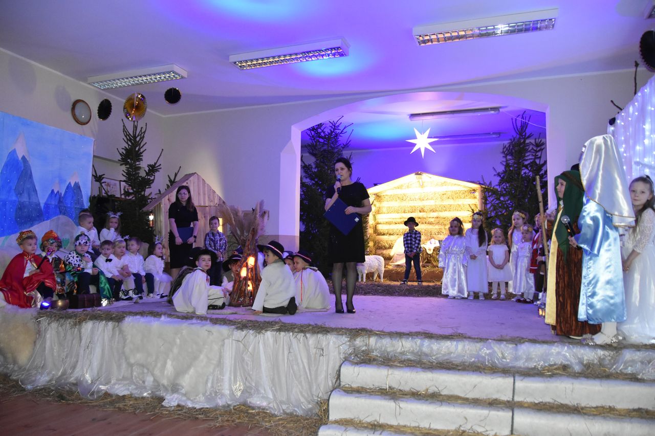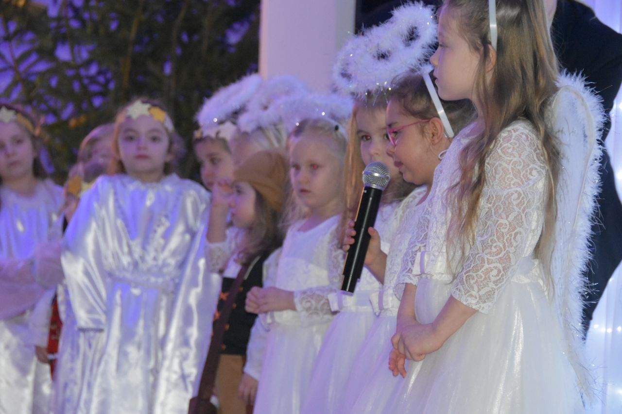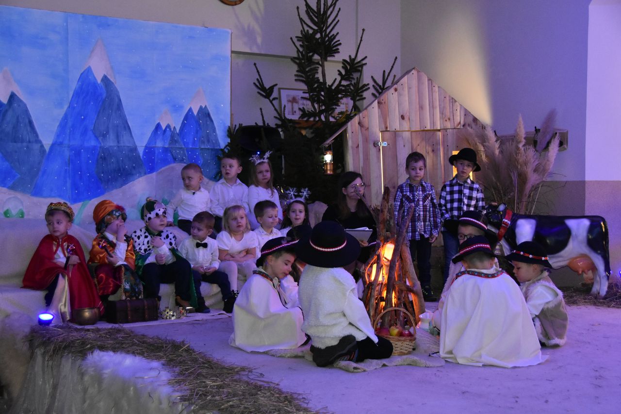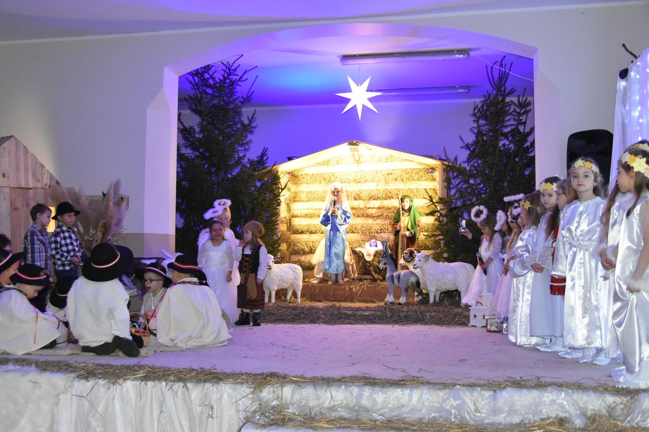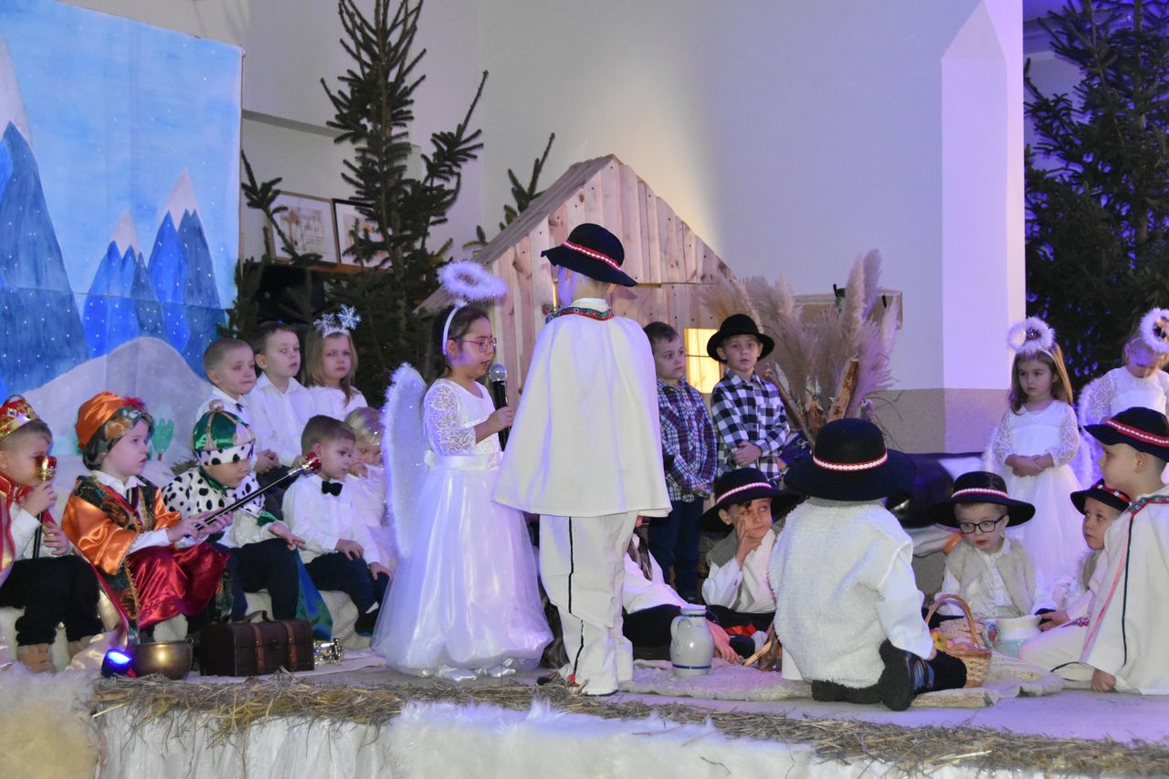 Przygotowany przez dzieci program artystyczny zachwycił publiczność. Mali artyści z wielkim zaangażowaniem wcielili się w swoje role, prezentując kolędy, wiersze i scenki bożonarodzeniowe. Ich występ został nagrodzony gromkimi brawami, a na twarzach widzów nie brakowało uśmiechów i wzruszenia.