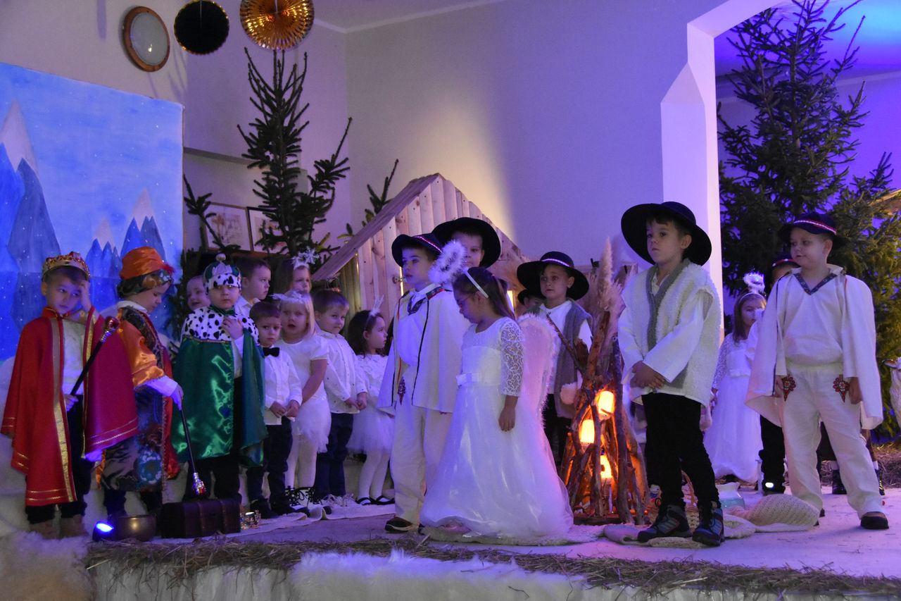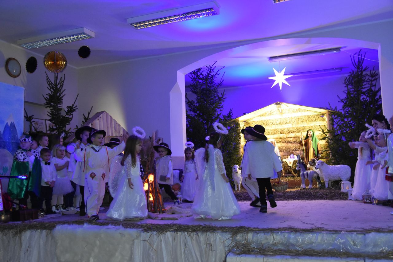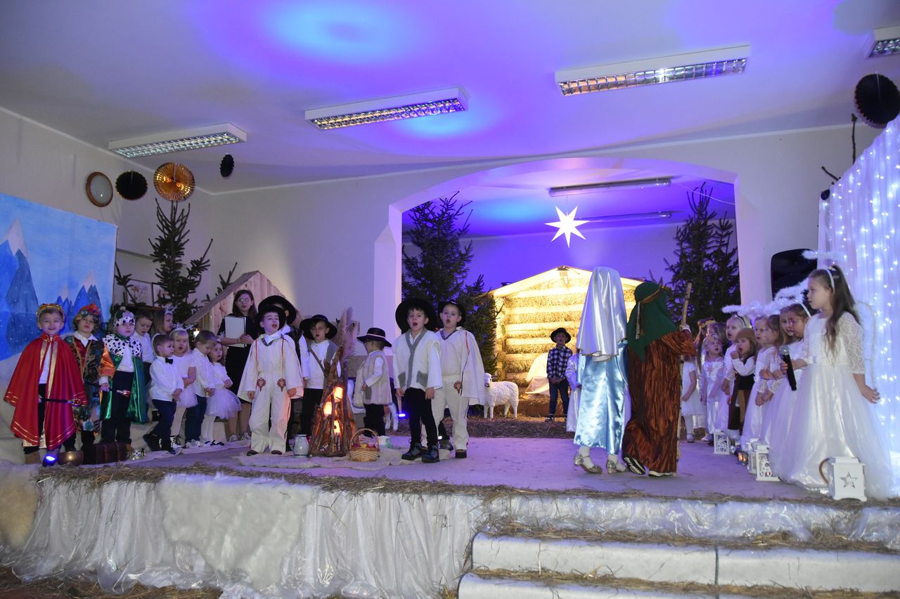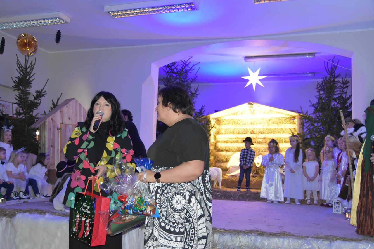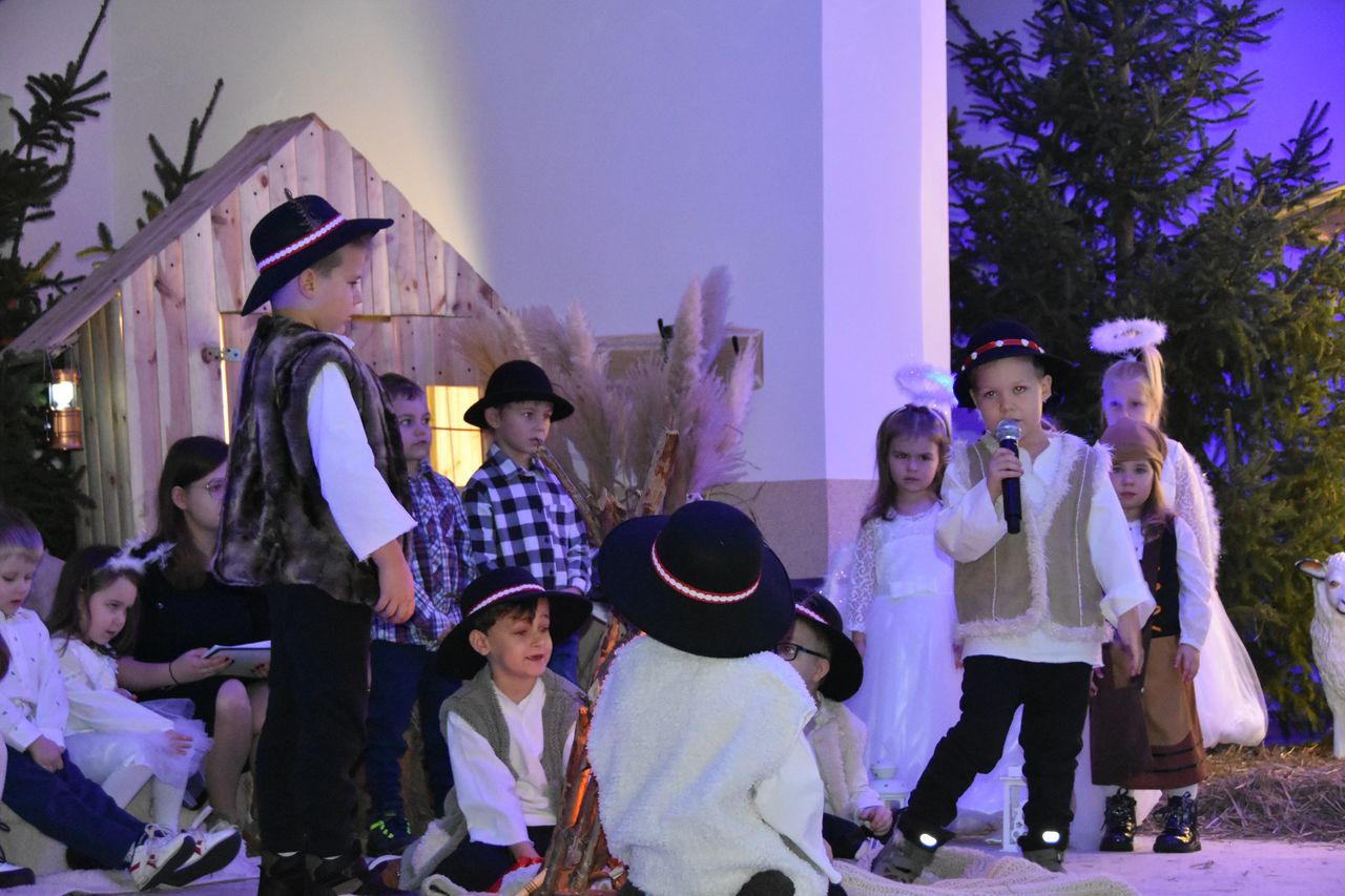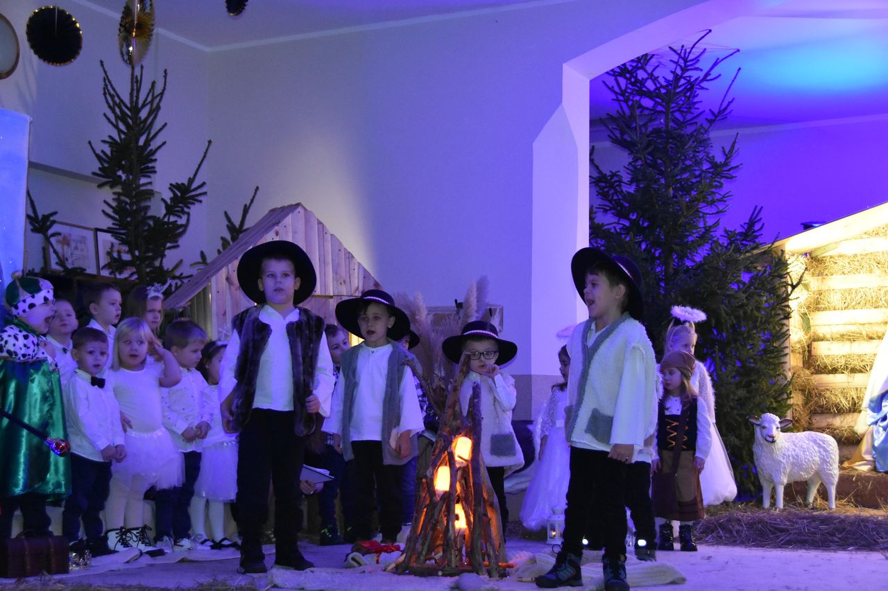 Przygotowany przez dzieci program artystyczny zachwycił publiczność. Mali artyści z wielkim zaangażowaniem wcielili się w swoje role, prezentując kolędy, wiersze i scenki bożonarodzeniowe. Ich występ został nagrodzony gromkimi brawami, a na twarzach widzów nie brakowało uśmiechów i wzruszenia.
