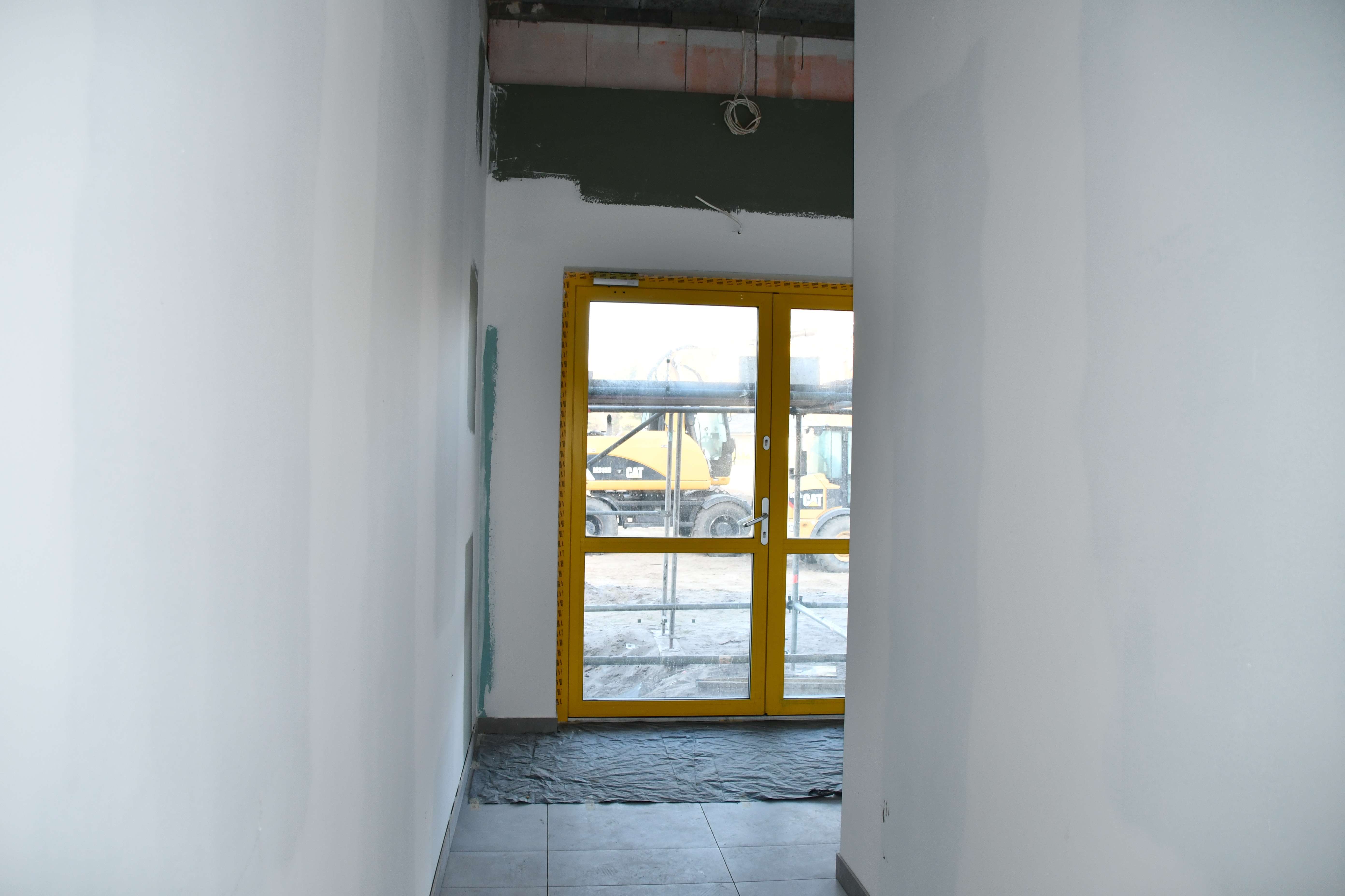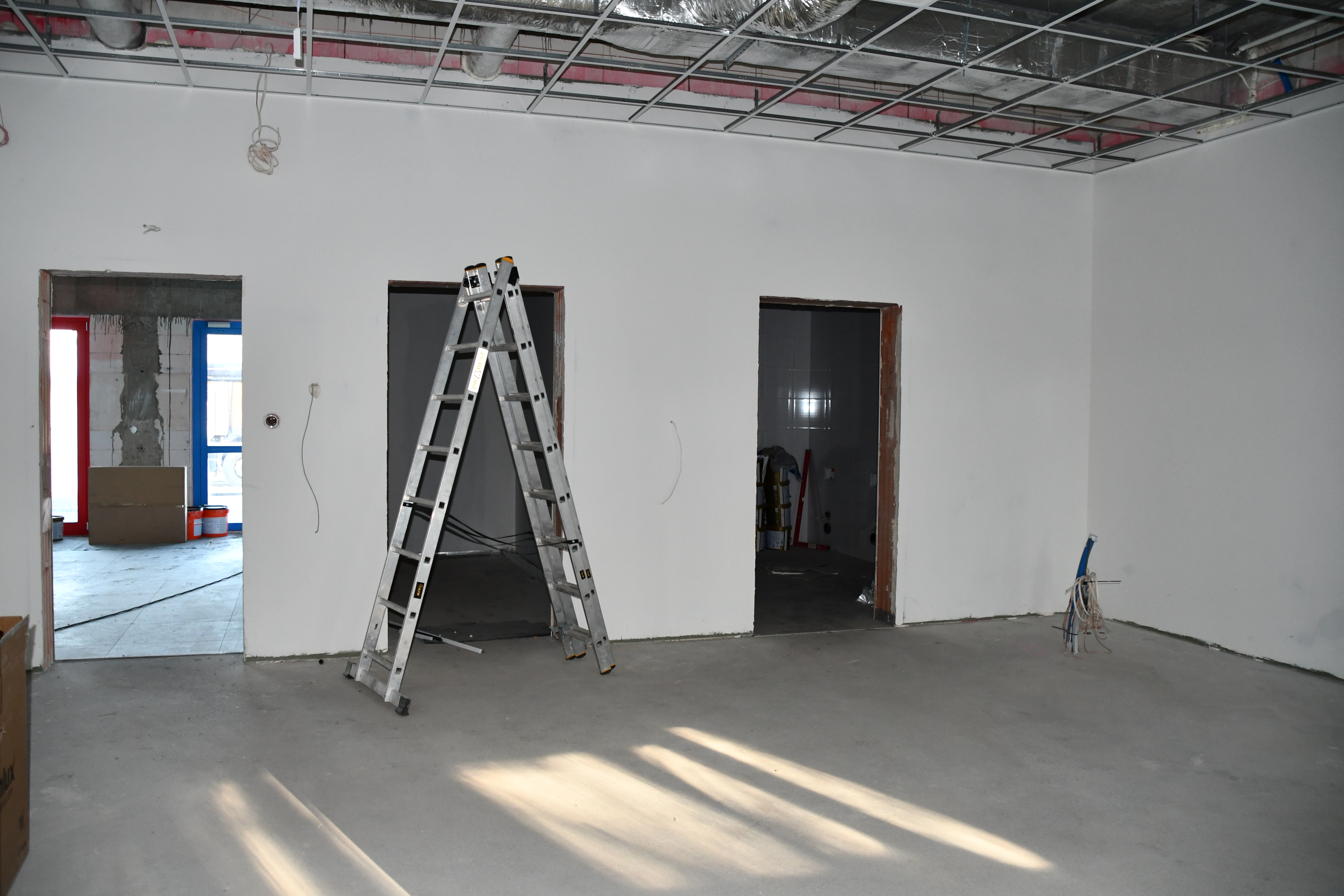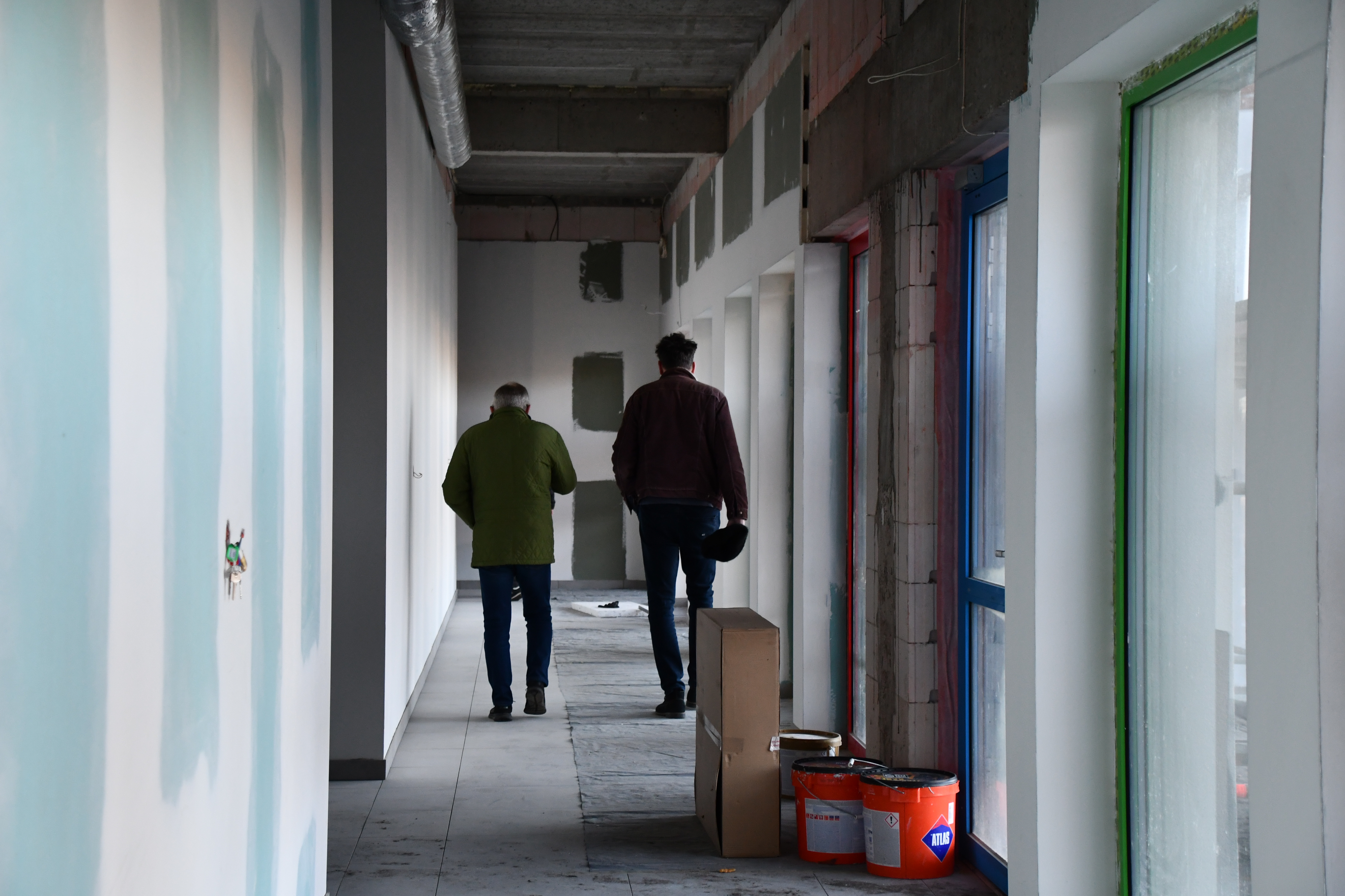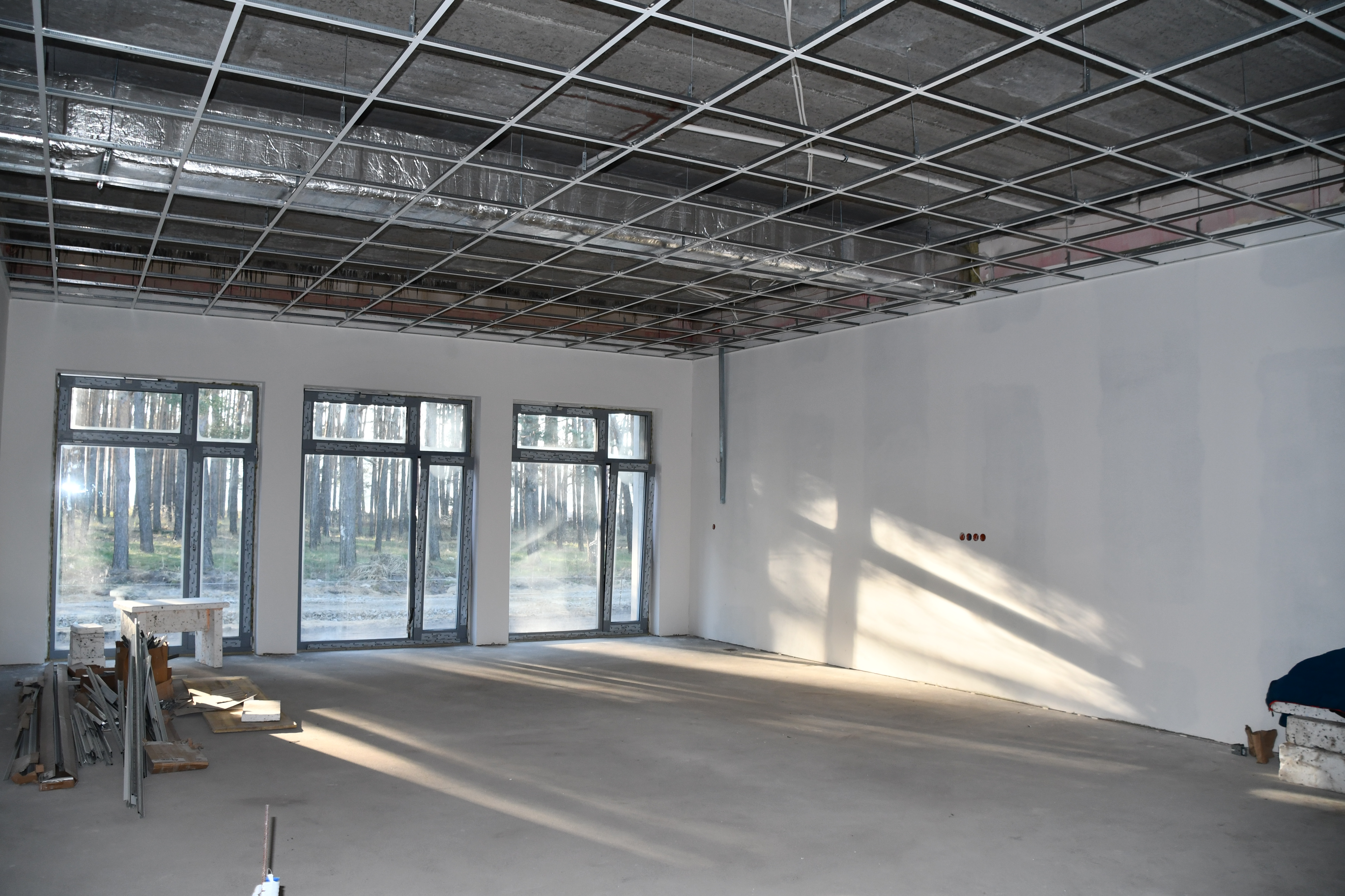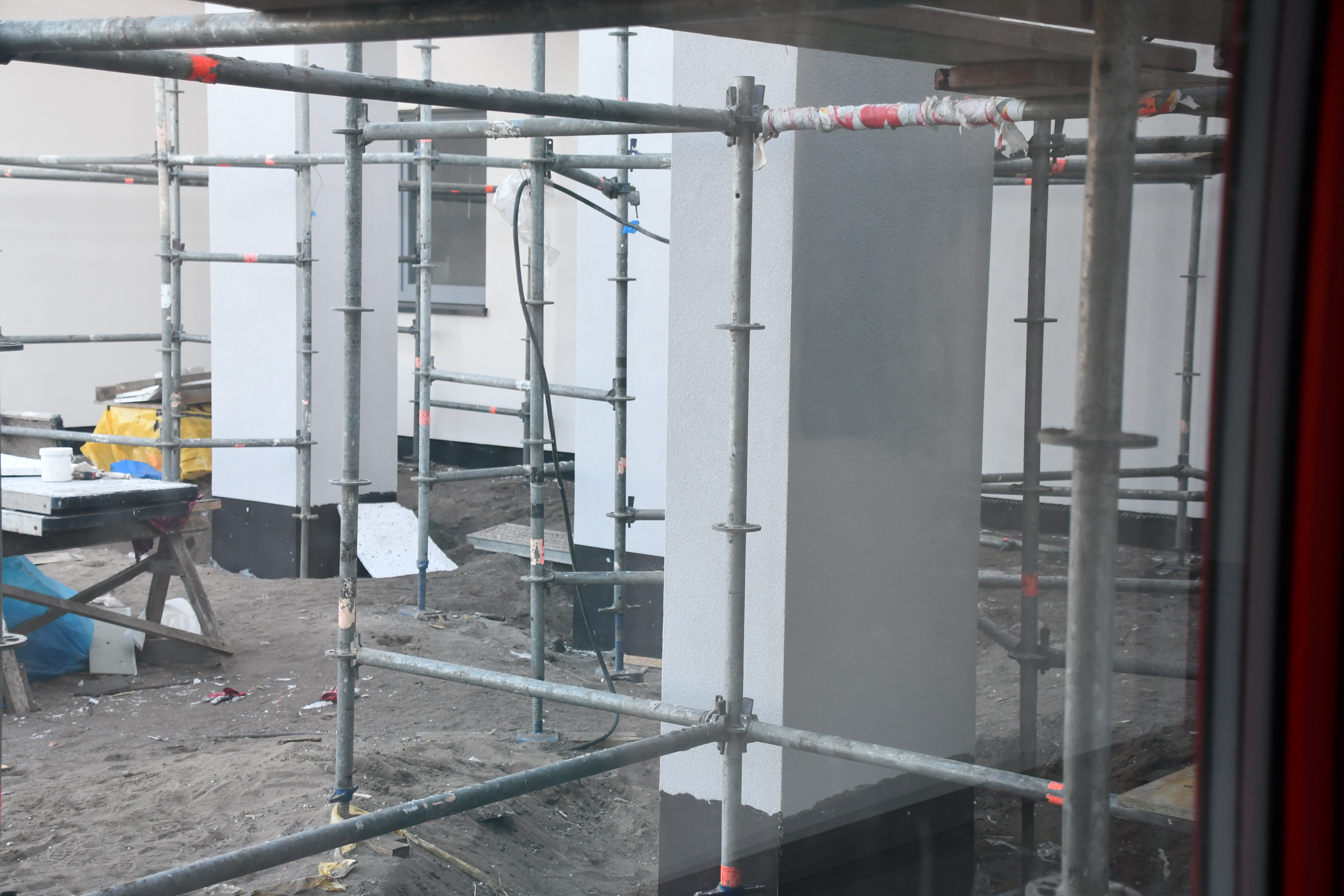 Na terenie inwestycji trwają prace wykończeniowe związane z zagospodarowaniem terenu. Równolegle realizowane są prace wewnątrz budynku oraz prace przy elewacji, które stopniowo nadają obiektowi jego ostateczny wygląd.