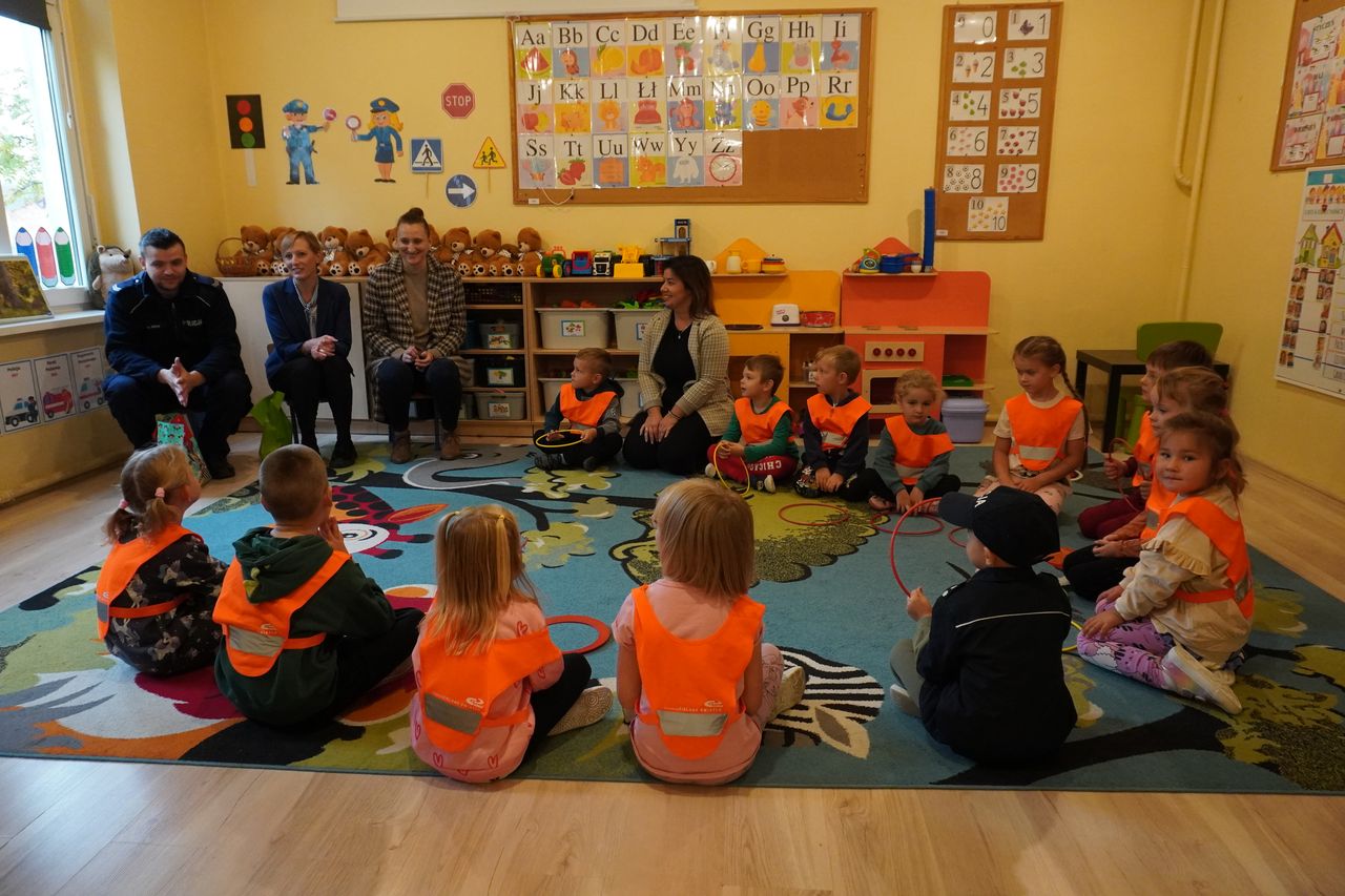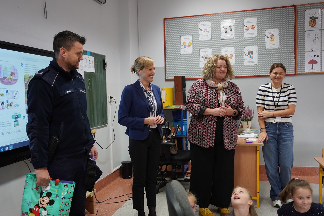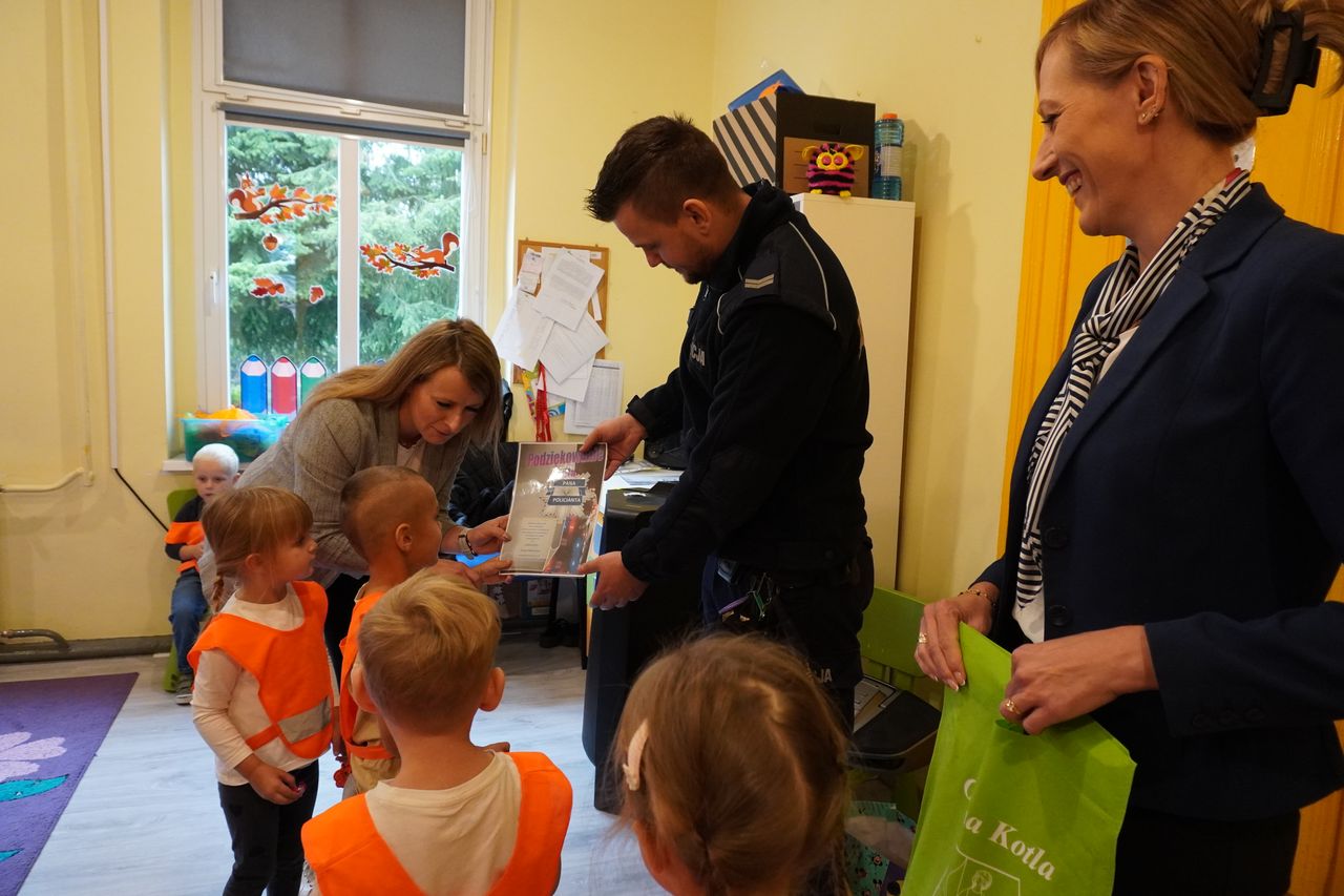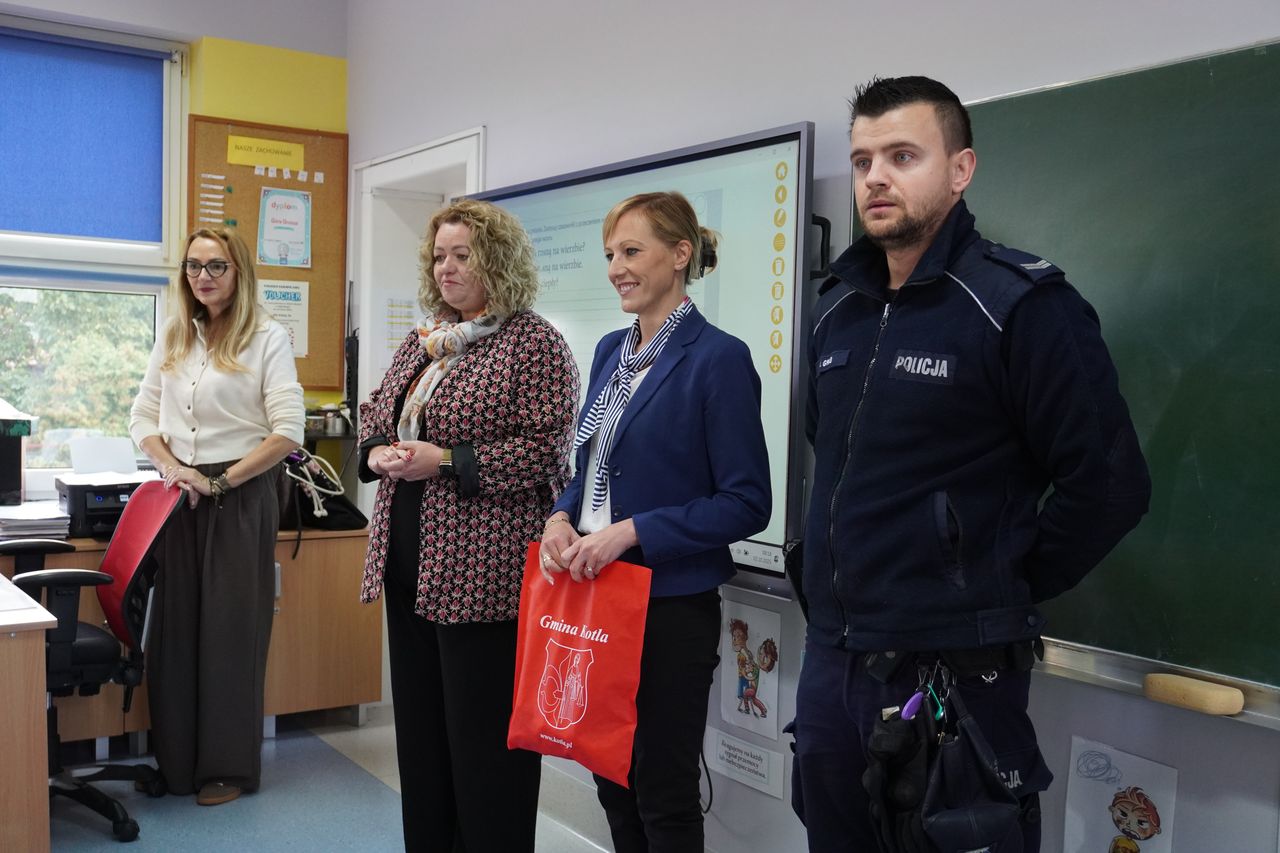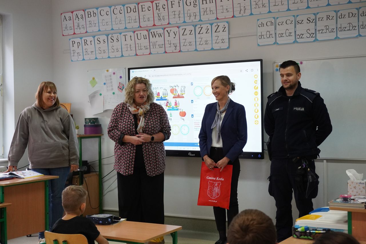 Dziś (02.10) w ramach akcji "Bezpieczna droga do szkoły", placówki oświatowe na terenie Gminy Kotla odwiedzili: Wójt Kamila Suchocka-Szperlik, pracownik urzędu Dorota Bartczak oraz starszy sierżant Maciej Grab Dzielnicowy Rejonu Gminy Kotla, którzy w trosce o bezpieczeństwo pytali najmłodszych z ich wiedzy na temat bezpieczeństwa ruchu drogowego. Dzieci z klas I-III Szkoły Podstawowej im. Kornela Makuszyńskiego w Kotli, Oddziału Przedszkolnego w Chociemyśli, Przedszkola Publicznego w Kotli oraz Niepublicznego Przedszkola „Chatka Puchatka” w Głogówku wzorowo odpowiadały na zadane zagadki i otrzymały nagrody: Pan Policjant rozdawał cukierki, natomiast Wójt dawała odblaski zakupione z budżetu Gminy Kotla, które zostały przypięte do tornistrów.
