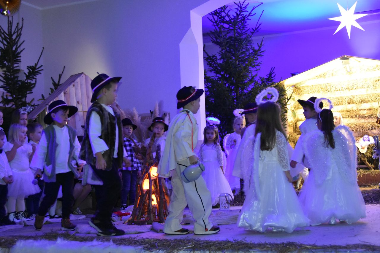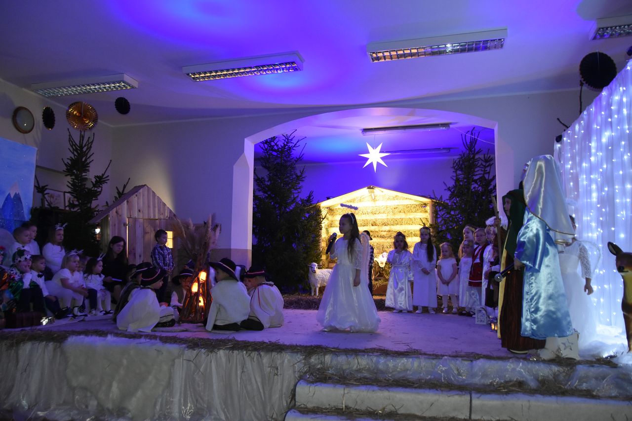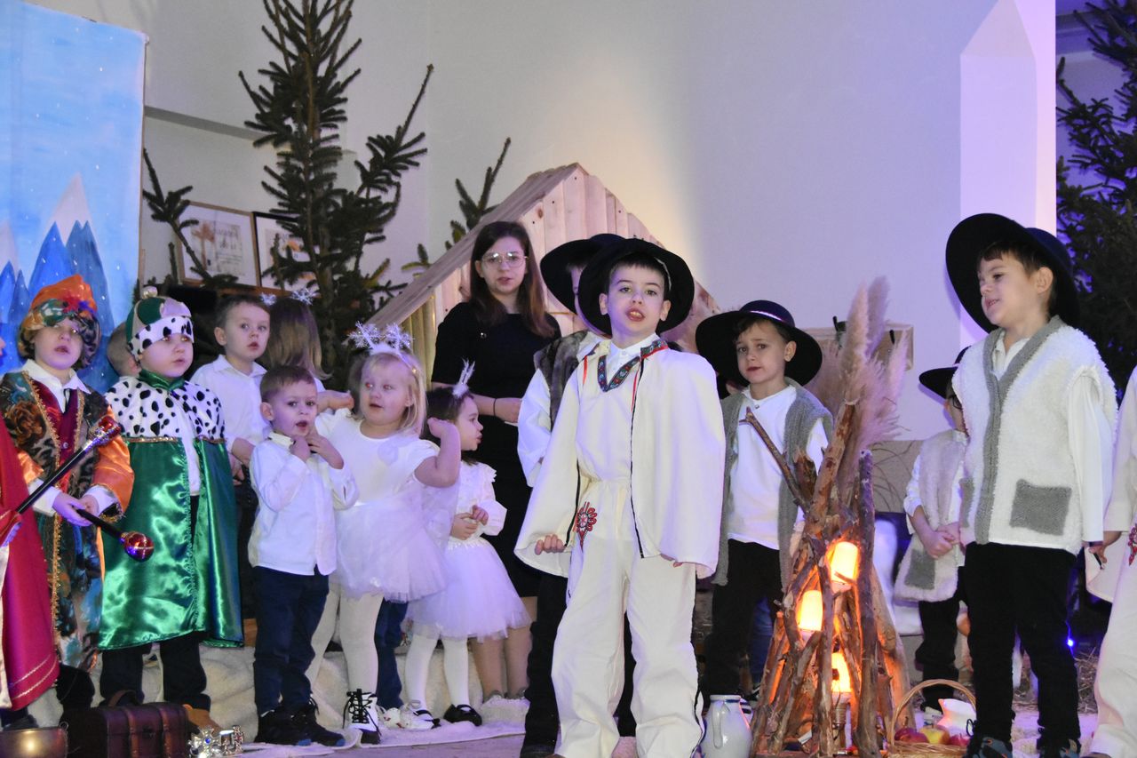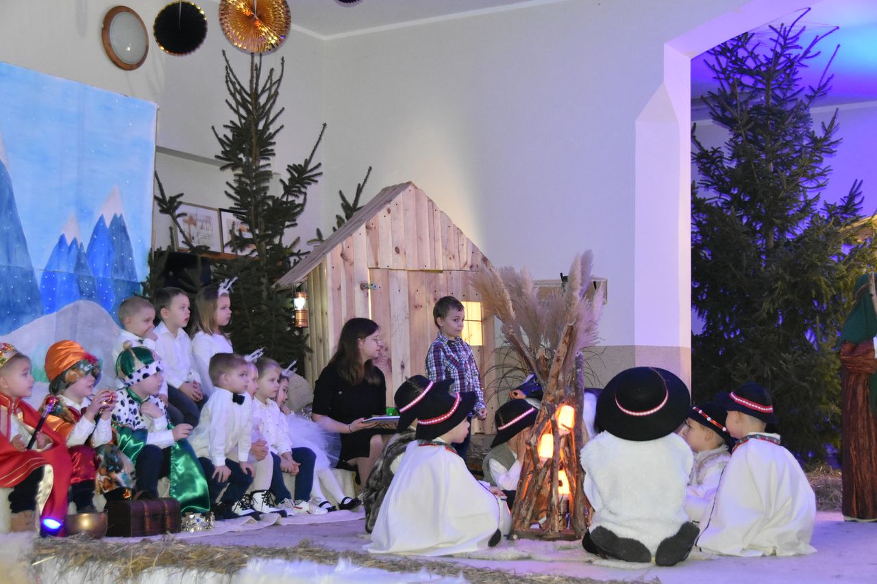 Przygotowany przez dzieci program artystyczny zachwycił publiczność. Mali artyści z wielkim zaangażowaniem wcielili się w swoje role, prezentując kolędy, wiersze i scenki bożonarodzeniowe. Ich występ został nagrodzony gromkimi brawami, a na twarzach widzów nie brakowało uśmiechów i wzruszenia.