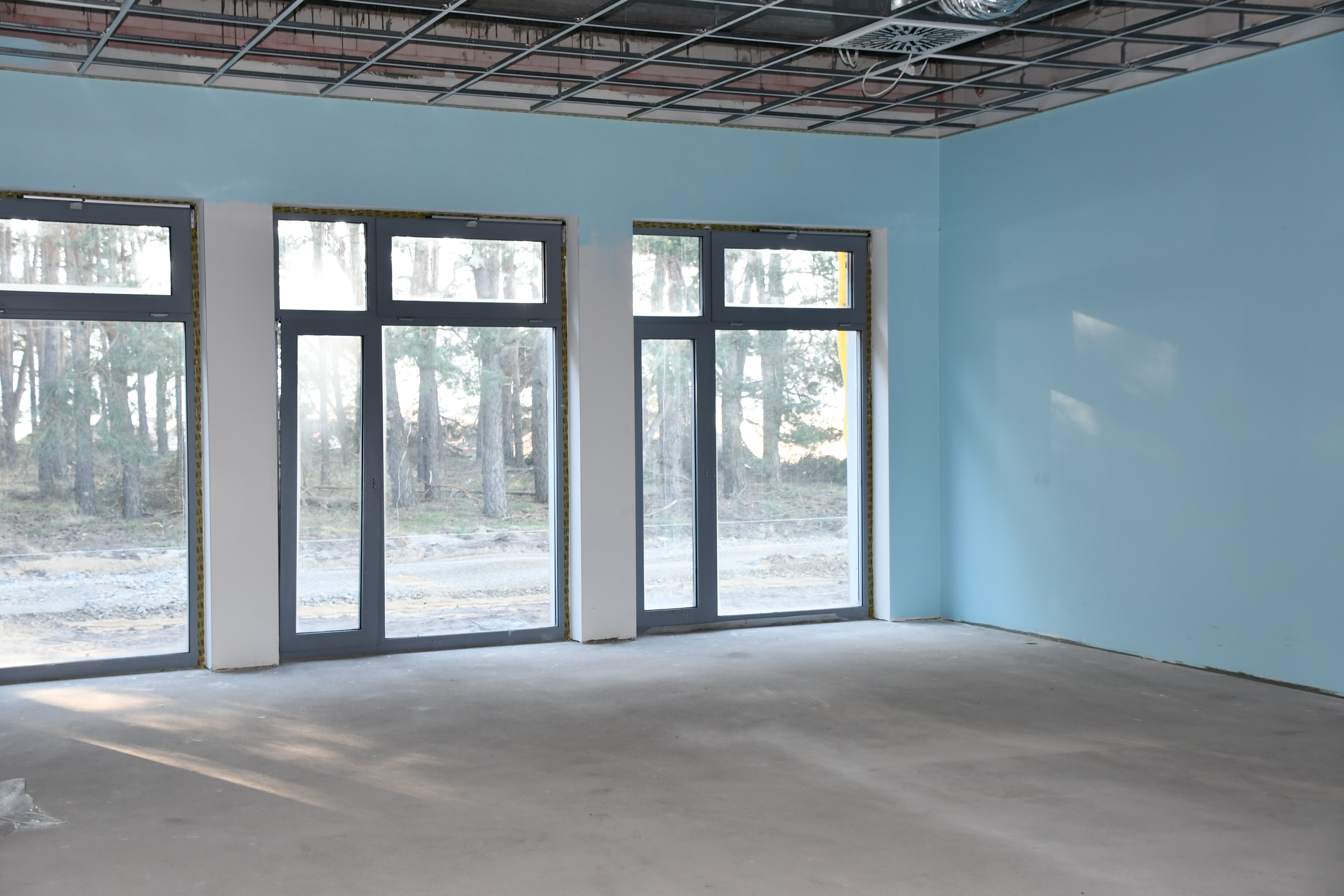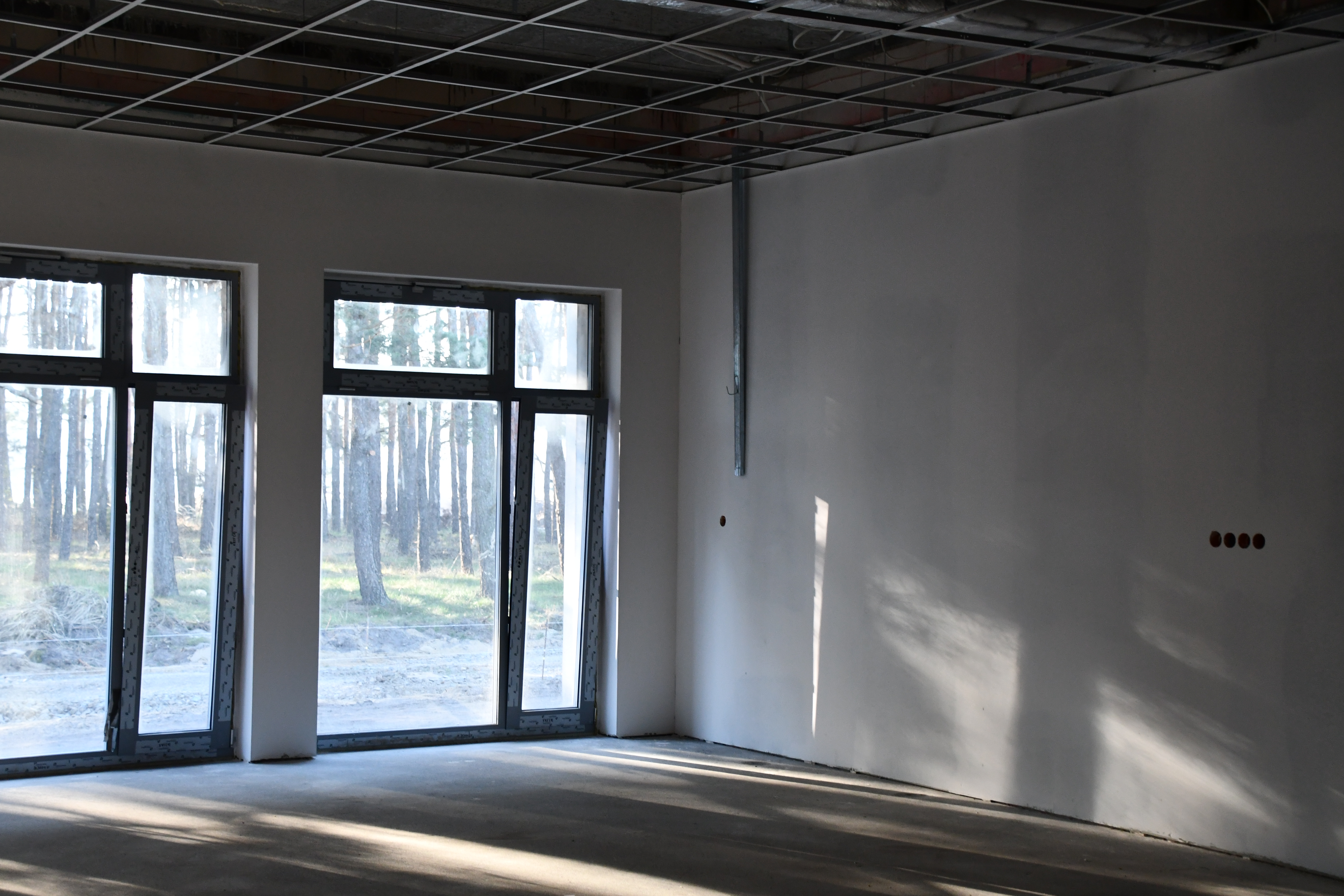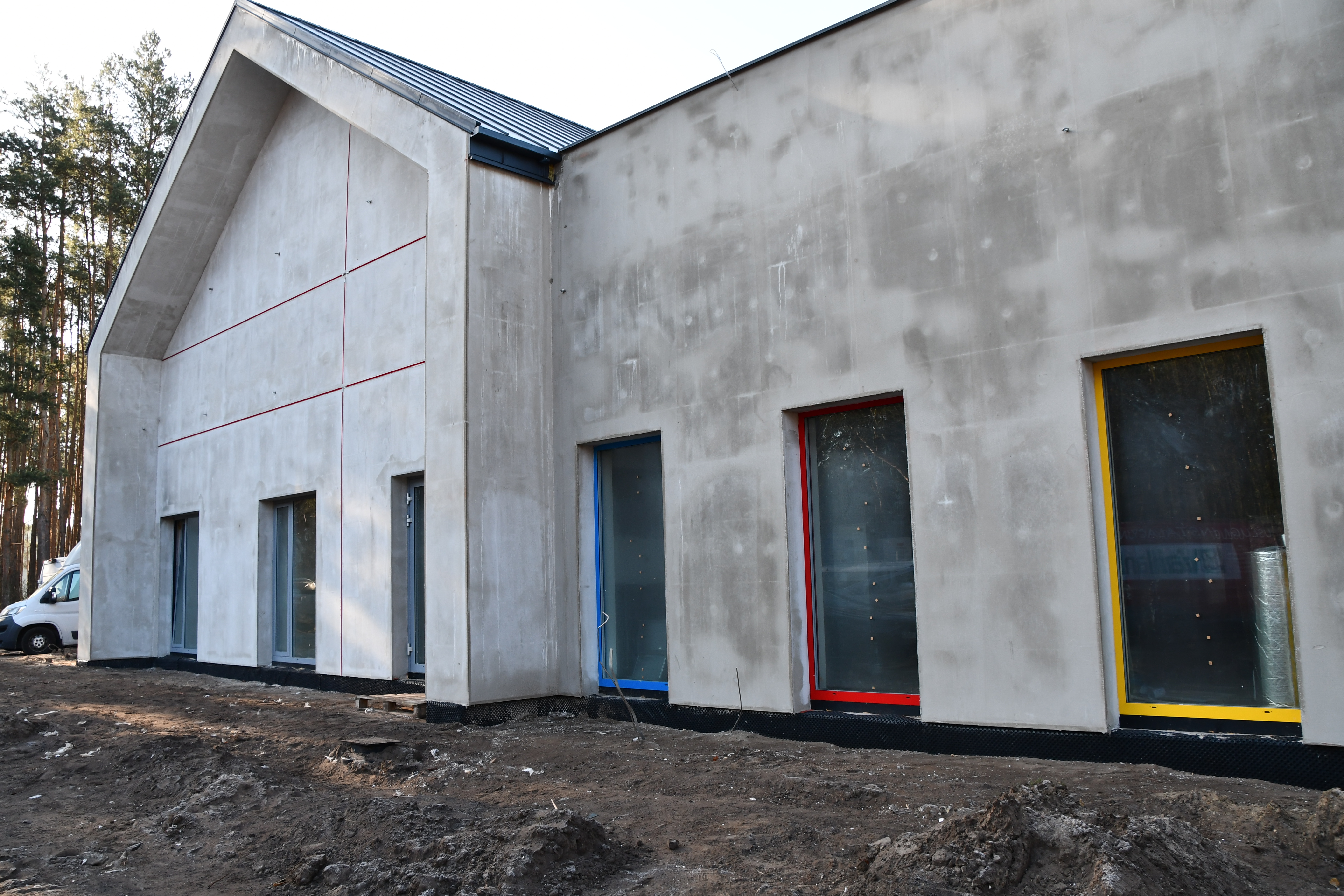 Na terenie inwestycji trwają prace wykończeniowe związane z zagospodarowaniem terenu. Równolegle realizowane są prace wewnątrz budynku oraz prace przy elewacji, które stopniowo nadają obiektowi jego ostateczny wygląd.