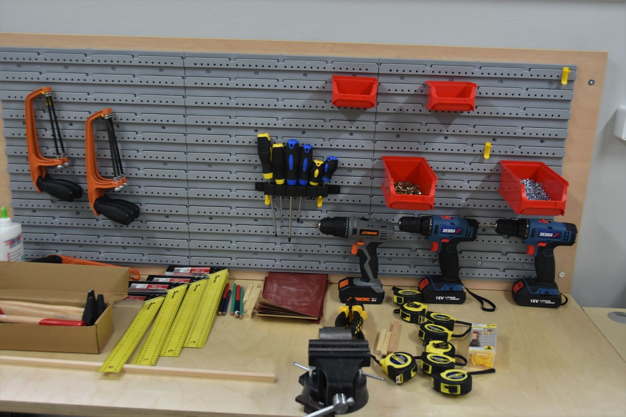 Zakupiono stoły warsztatowe z tablicami narzędziowymi, szafy metalowe na narzędzia dla uczniów. Sprzęt taki jak m.in.: akumulatorowe wkrętarko-wiertarki, wiertarka stołowa, szlifierka kątowa, wyrzynarka stołowa, stacje lutownicze, wypalarki , imadła ślusarskie czy piła ramowa. Narzędzia dla każdego ucznia to ponad 40 różnych pozycji do obróbki drewna i metalu. Uzupełnieniem pracowni są materiały zużywalne typu sklejki, listewki, wkręty, gwoździe, wiertła, bity, kleje, papiery ścierne .