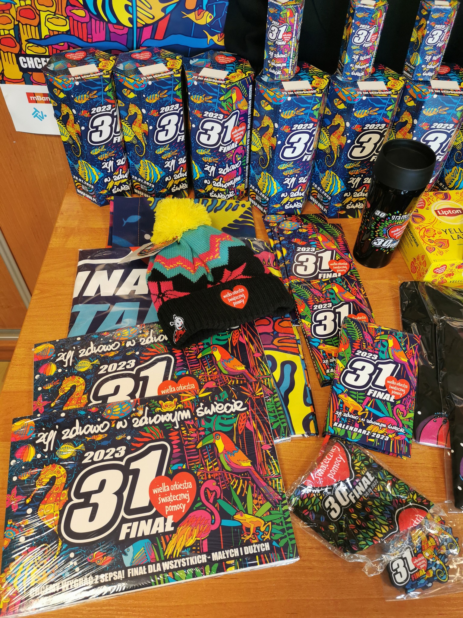 Oprócz standardowych koszulek i kalendarzy mamy w tym roku m.in. ręcznik z mikrofibry, kubek termiczny, płytę CD Kasi Kowalskiej Live Pol'And'Rock 2021, okładkę na telefon Samsung Galaxy M21, flagę 31.Finału WOŚP i komin 30.Finału WOŚP.