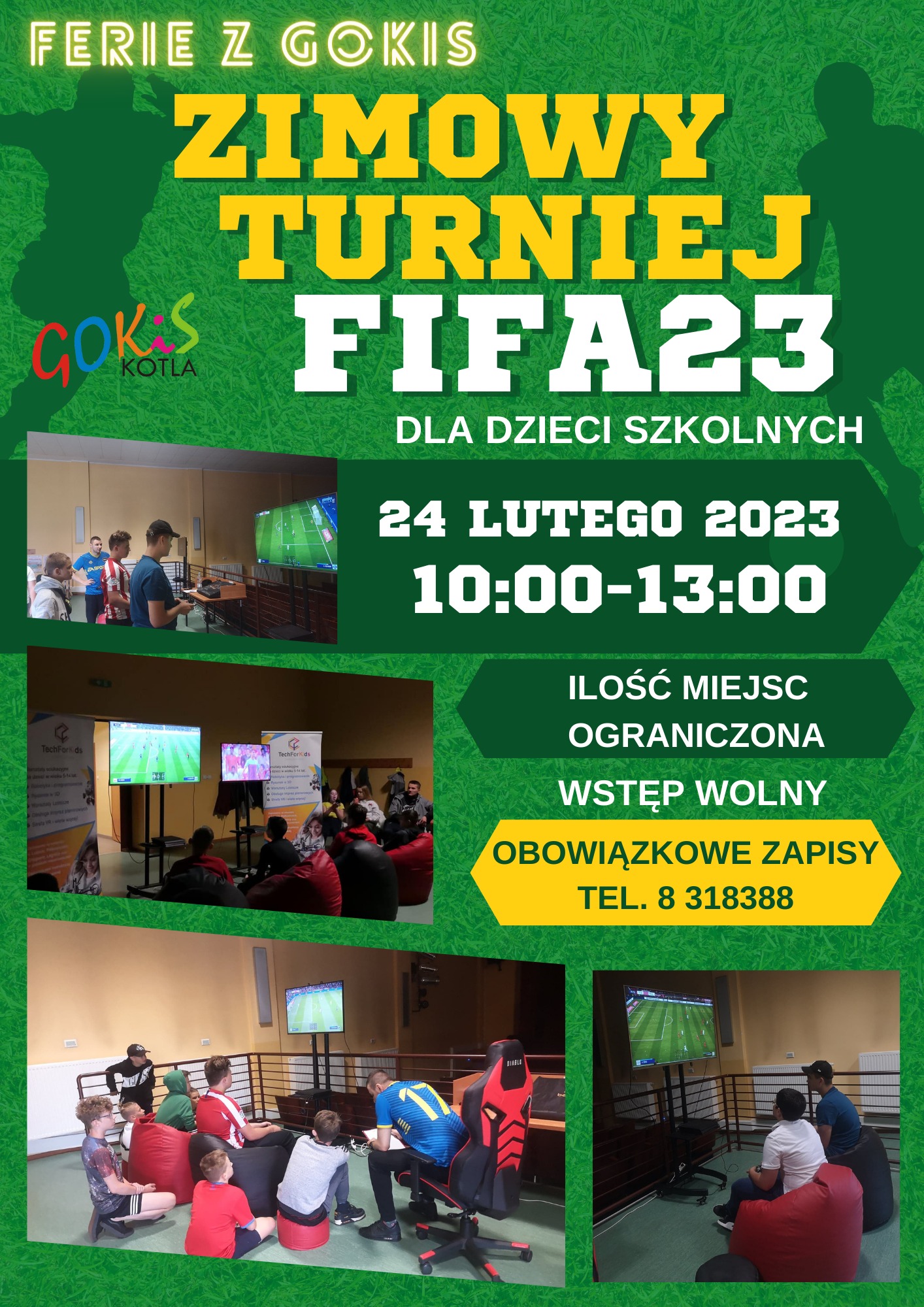 Rozgrywki FIFA23 będą zrealizowane w ramach ferii zimowych 24.02.2023 r. w godzinach od 10:00 do 13:00. Rozgrywki będą przeprowadzone w sali widowiskowej GOKiS przez wykwalifikowanego instruktora. GOKiS zapewnia wszystkie niezbędne sprzęty ze sfery wirtualnej rzeczywistości z dźwiękiem VR od PlayStation PRO 4 oraz telewizory 55 calowe. Zajęcia są bezpłatne, jednak konieczne jest zapisanie dziecka. Szczegóły na plakacie.