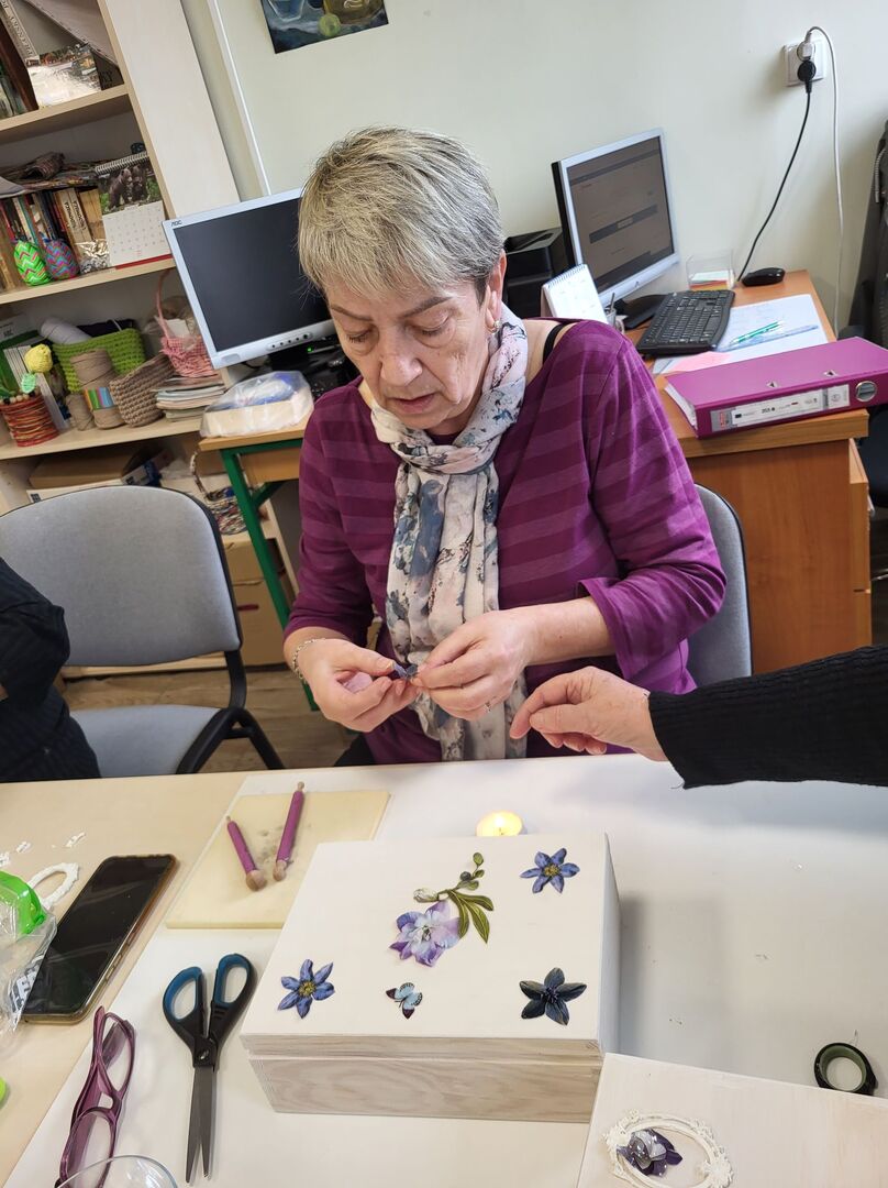 W trakcie zajęć z rękodzieła z gościem Uczestnicy Projektu pod czujnym okiem i przy pomocy P. Marioli wykonali piękne torby filcowe zdobiąc je techniką filcowania na sucho oraz ozdobne skrzyneczki metodą sospesso.