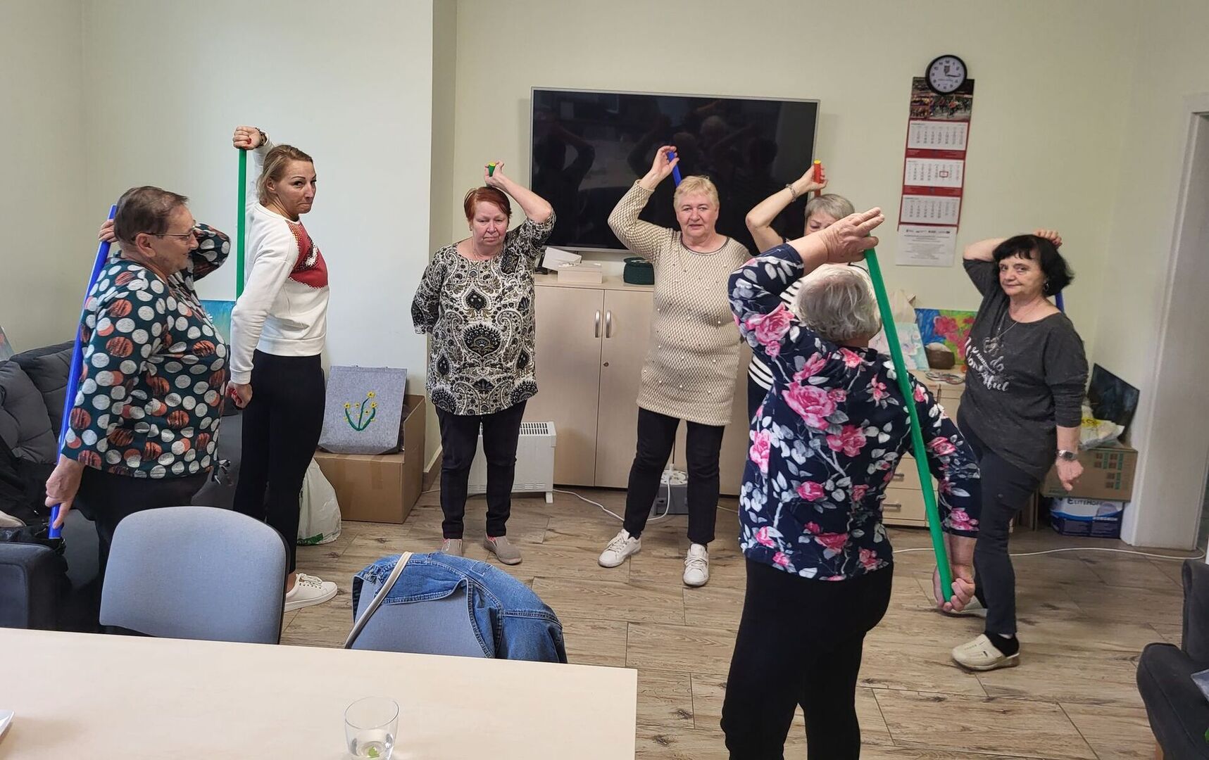 Podczas zajęć ruchowych - gimnastyki Uczestnicy Projektu wykonali ćwiczenia rozciągające i wzmacniające odcinek szyjny kręgosłupa. Pani Marta zakończyła zajęcia indywidualnym masażem smovey oraz wykonali ćwiczenia rozciągające z laską gimnastyczną.